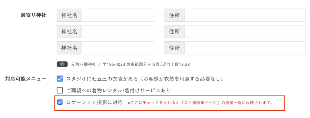 管理画面>「七五三」>七五三詳細情報>詳細情報を編集する>「対応可能メニュー」で「ロケーション撮影に対応」にチェックを入れる
